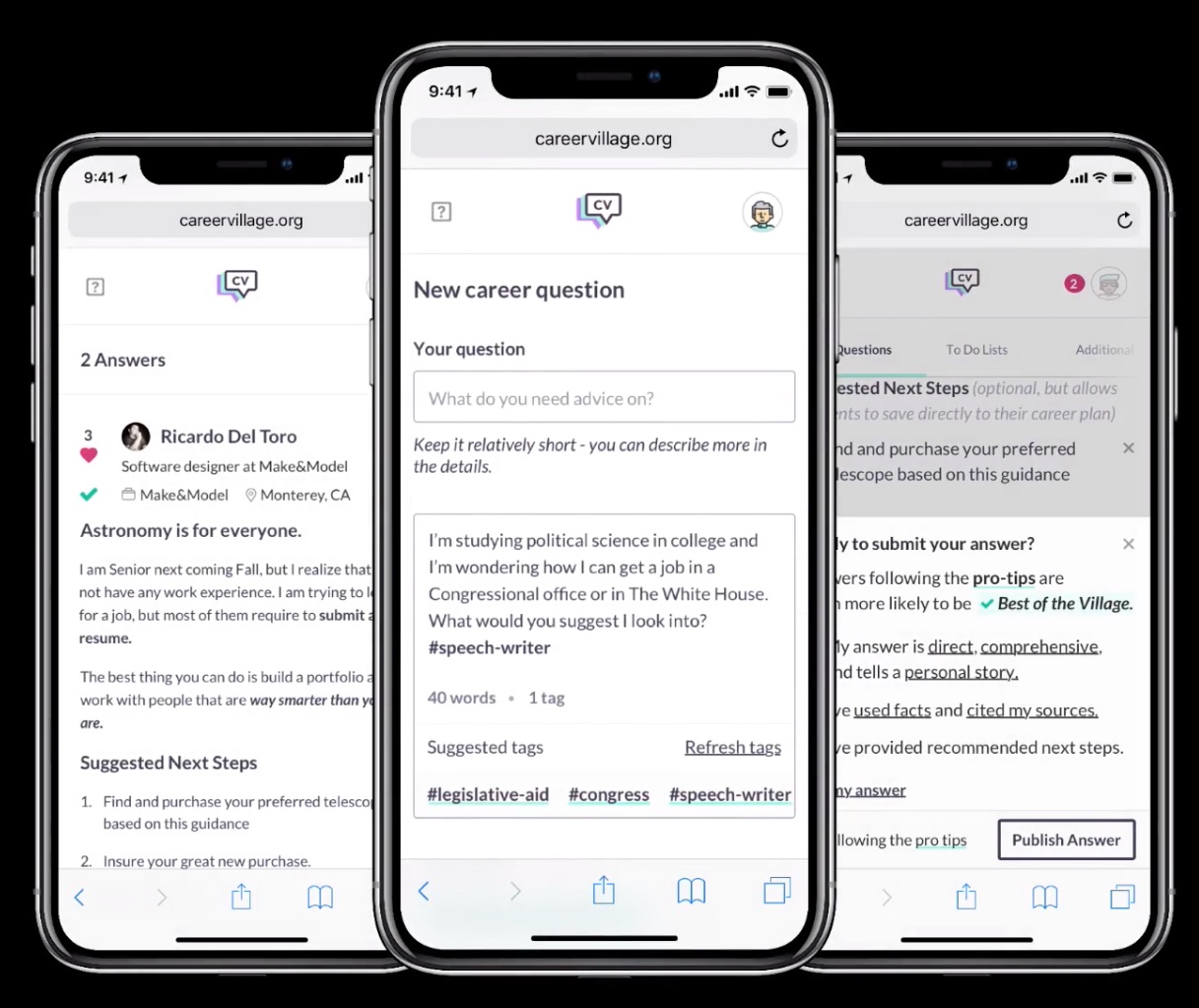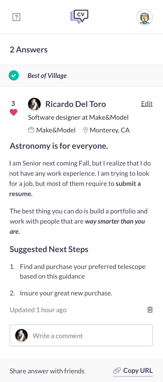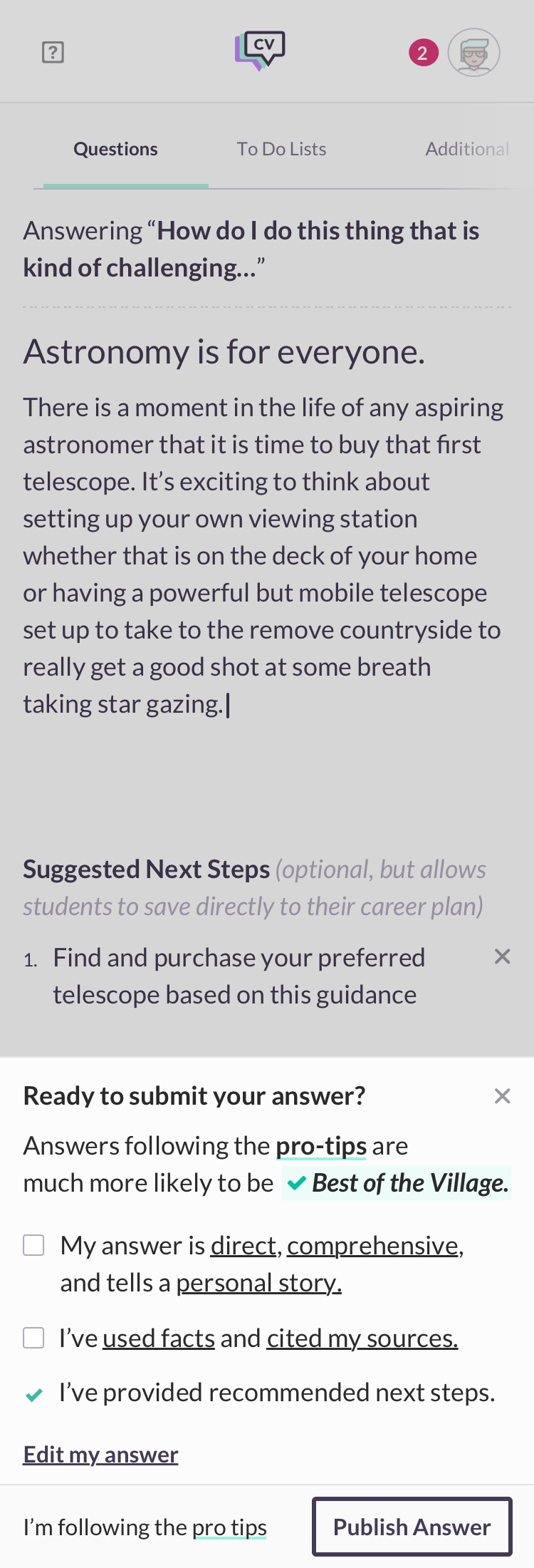 The value of CareerVillage is the answers. Working on systems to improve answers not only gives CareerVillage a competitive advantage, it also serves our users and allows us to stay true to our mission of making career knowledge more accessible. Increasing the quality of the answers posted to the site required designing systems that not only encourage good answers but clearly defined what makes an answer a valuable one to students.